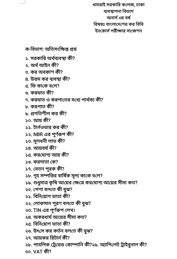 অনার্স ৩য় বর্ষের ব্যবস্থাপনা বিভাগের বাংলাদেশের কর বিধি এবং পরিসংখ্যান বিষয়ের নির্বাচনী,প্রাক নির্বাচনী পরীক্ষার এসাইনমেন্ট এবং ইনকোর্স পরীক্ষার সাজেশন। |