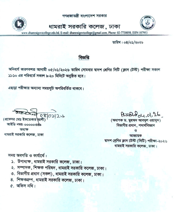 Notice Title : দ্বাদশ শ্রেণির ক্লাস টেস্ট (সিটি) পরীক্ষার আগামী ৫/০১/২০২৬ তারিখের সংশোধিত সময়সূচি