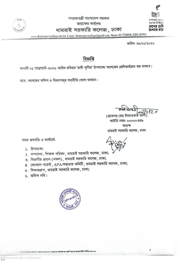 Notice Title : মাঘী পূর্ণিমা উপলক্ষ্যে শ্রেণিকার্যক্রম বন্ধের বিজ্ঞপ্তি