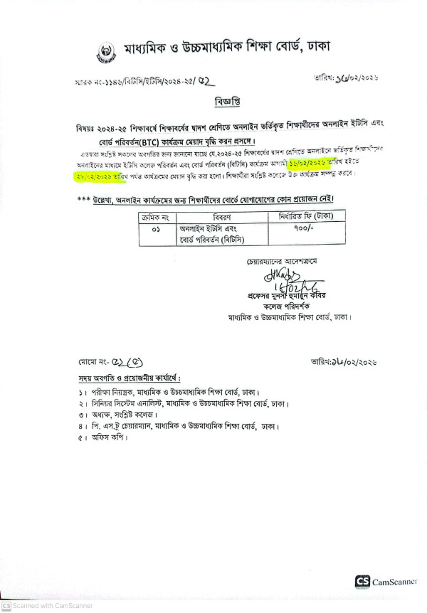 Notice Title : দ্বাদশ শ্রেণীর শিক্ষার্থীদের অনলাইনের মাধ্যমে ইটিসি এবং বোর্ড পরিবর্তনের মেয়াদ বৃদ্ধি