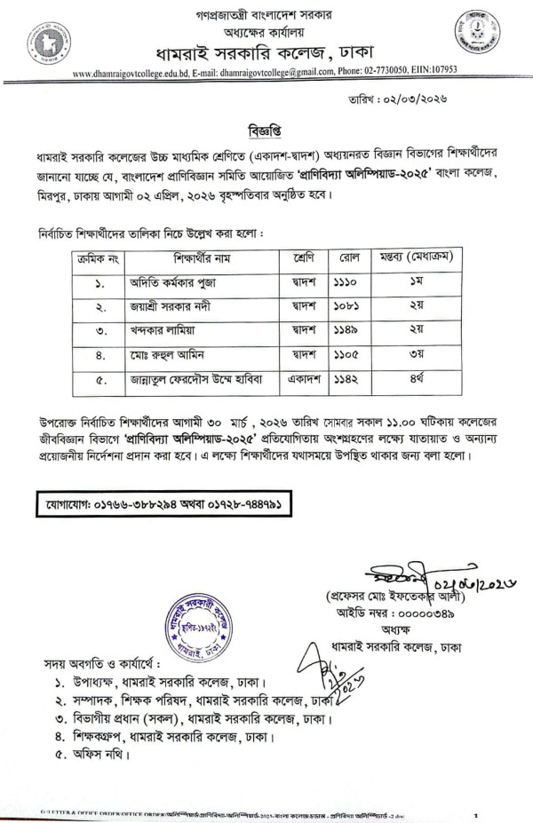 Notice Title : প্রাণিবিদ্যা অলিম্পিয়াড-২০২৫ প্রতিযোগিতার জন্য নির্বাচিত শিক্ষার্থীদের তালিকা
