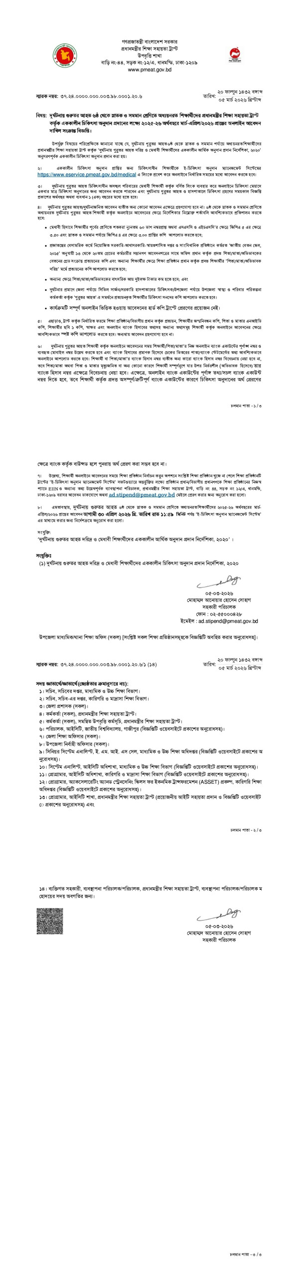 Notice Title : দুর্ঘটনায় গুরুতর আহত অধ্যয়নরত শিক্ষার্থীদের প্রধানমন্ত্রীর শিক্ষা সহায়তা ট্রাস্ট কর্তৃক এককালীন চিকিৎসা অনুদান প্রদানের লক্ষ্যে অনলাইন আবেদন দাখিলের বিজ্ঞপ্তি (লিংক- https://www.eservice.pmeat.gov.bd/medical/)