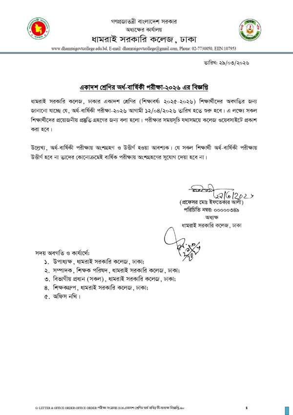 Notice Title : একাদশ শ্রেণির অর্ধ-বার্ষিকী পরীক্ষা-২০২৬ এর বিজ্ঞপ্তি