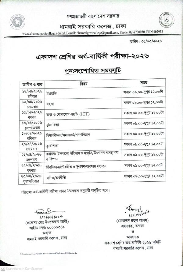 Notice Title : একাদশ শ্রেণির অর্ধ-বার্ষিকী পরীক্ষা-২০২৬ এর পুন:সংশোধিত সময়সূচি