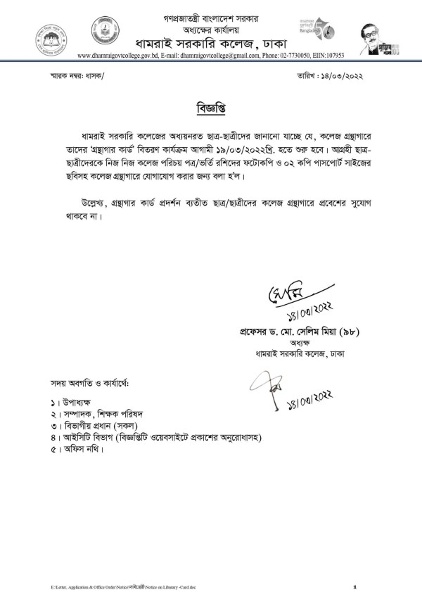 Notice Title : গ্রন্থাগার কার্ড বিতরণের বিজ্ঞপ্তি