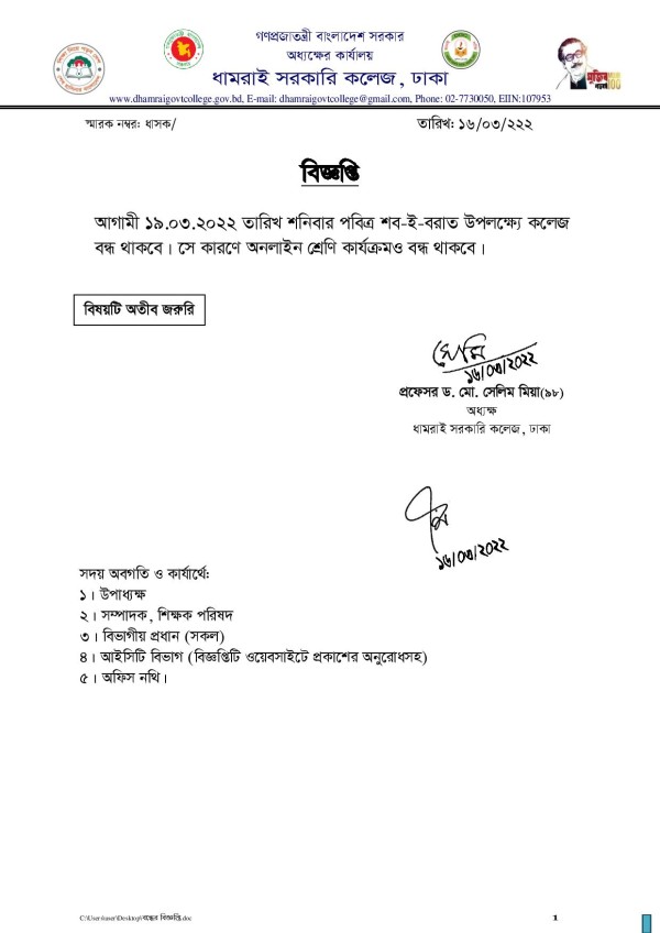 Notice Title : কলেজ বন্ধের নোটিশ