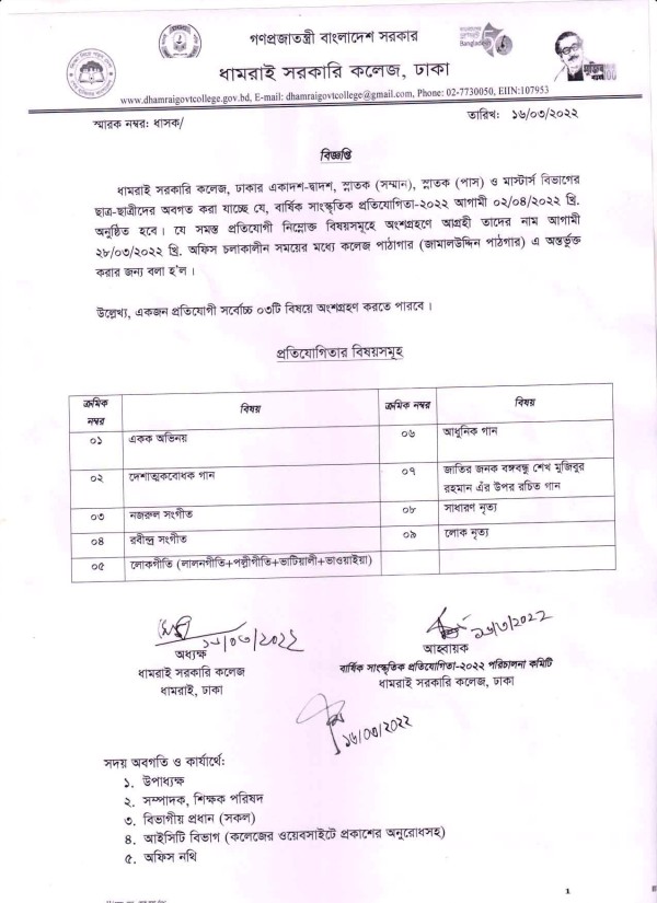 Notice Title : বার্ষিক সাংস্কৃতিক প্রতিযোগীতা-২০২২ এ শিক্ষার্থীদের নাম অনুর্ভুক্তি প্রসঙ্গে