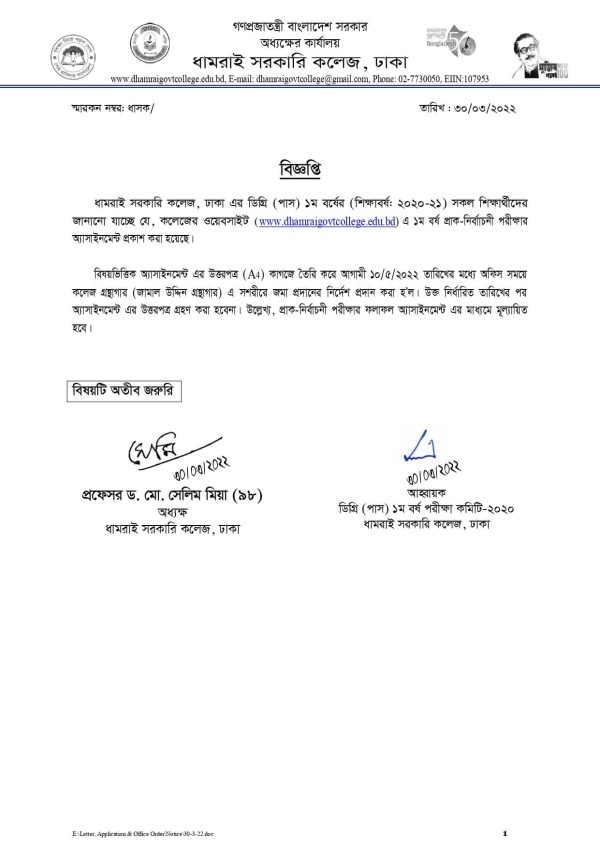 Notice Title : ডিগ্রি (পাস) ১ম বর্ষের প্রাক-নির্বাচনী পরীক্ষার অ্যাসাইনমেন্ট জমা প্রদানের বিজ্ঞপ্তি