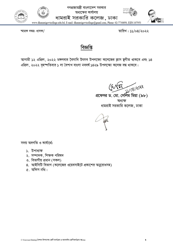Notice Title : ক্লাস স্থগীত ও কলেজ বন্ধের বিজ্ঞপ্তি