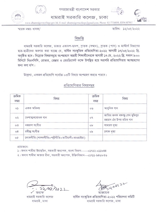 Notice Title : বার্ষিক সাংস্কৃতিক প্রতিযোগিতা ২০২২ এর বিজ্ঞপ্তি