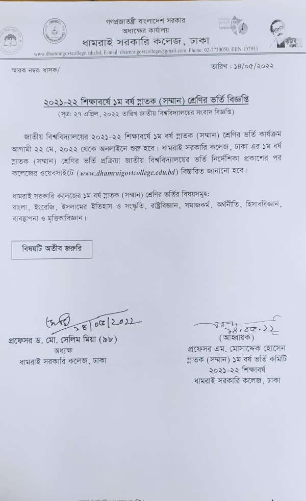 Notice Title : ২০২১-২০২২ শিক্ষাবর্ষে ১ম বর্ষ স্নাতক (সম্মান) শ্রেণির ভর্তি বিজ্ঞপ্তি