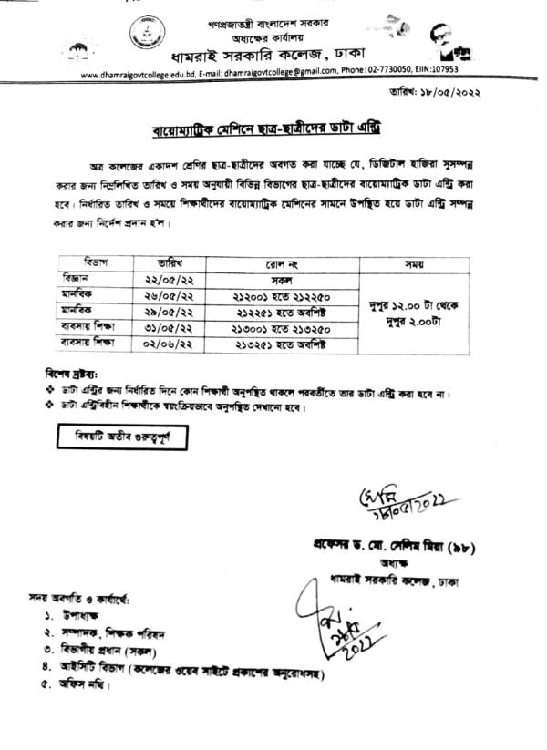 Notice Title : একাদশ শ্রেণির শিক্ষার্থীদের বায়োমেট্রিক ডাটা এন্ট্রি প্রসঙ্গে