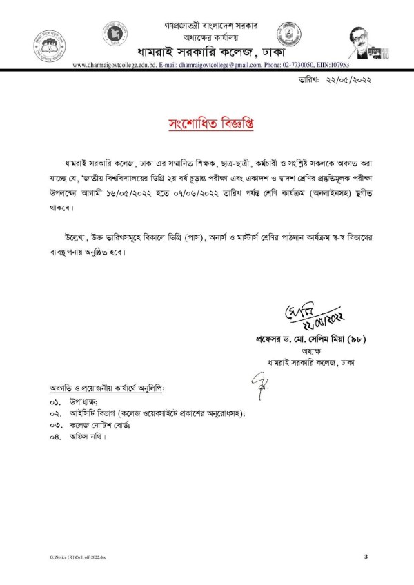 Notice Title : শ্রেণি কার্যক্রম স্থগীতের সংশোধিত বিজ্ঞপ্তি
