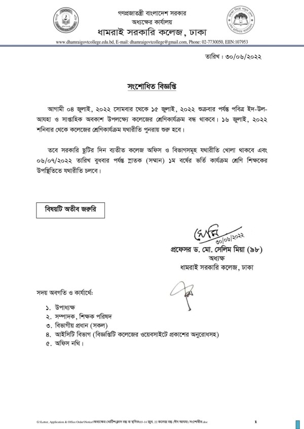 Notice Title : ইদ-উল-আযহা উপলক্ষ্যে শ্রেণি কার্যক্রম ও কলেজ বন্ধের সংশোধিত বিজ্ঞপ্তি