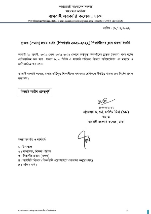 Notice Title : স্নাতক (সম্মান) ১ম বর্ষে ক্লাস শুরুর বিজ্ঞপ্তি