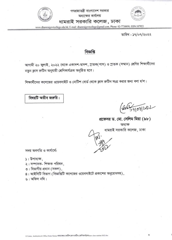 Notice Title : ক্লাস রুটিন বিষয়ক বিজ্ঞপ্তি