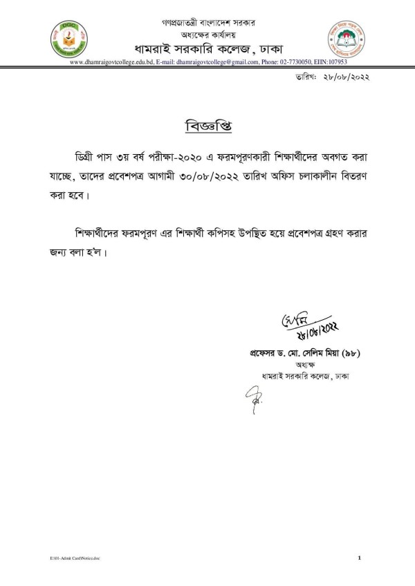 Notice Title : প্রবেশপত্র বিতরণ প্রসঙ্গে