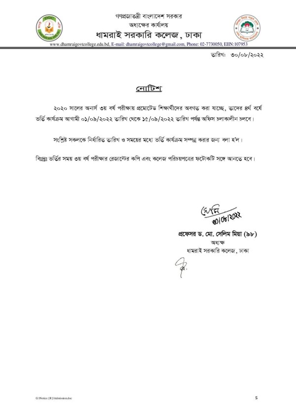 Notice Title : অনার্স ৪র্থ বর্ষে ভর্তির বিজ্ঞপ্তি