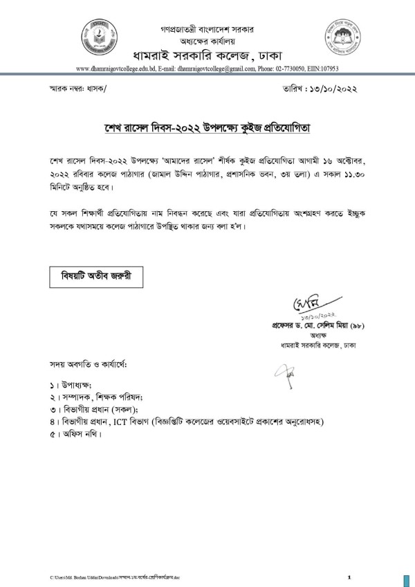 Notice Title : কুইজ প্রতিযোগিতা -২০২২
