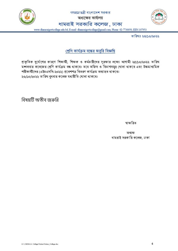 Notice Title : শ্রেণি কার্যক্রমের বন্ধের বিজ্ঞপ্তি