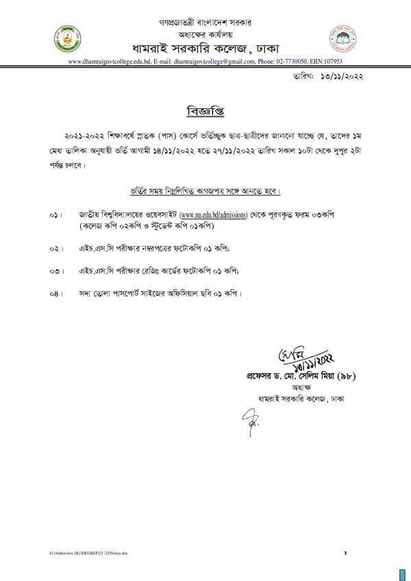Notice Title : স্নাতক (পাস) ১ম বর্ষে ভর্তির সময়সূচির বিজ্ঞপ্তি