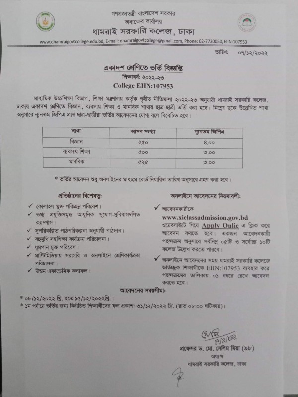 Notice Title : একাদশ শ্রেণিতে ভর্তির বিজ্ঞপ্তি
