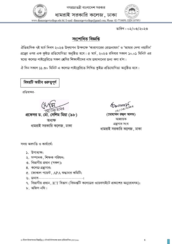 Notice Title : কুইজ প্রতিযোগিতার সংশোধিত বিজ্ঞপ্তি