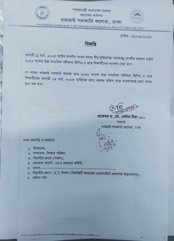 Notice Title : সংবর্ধণা বিষয়ক বিজ্ঞপ্তি