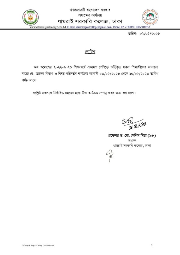 Notice Title : একাদশ শ্রেণির শিক্ষার্থীদের বিষয় ও গ্রুপ পরিবর্তনের বিজ্ঞপ্তি