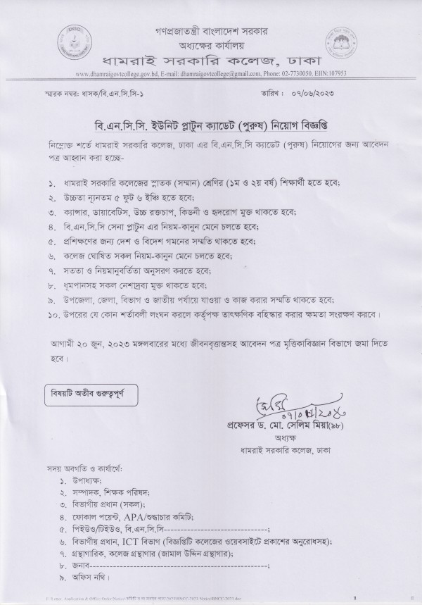 Notice Title : বিএনসিসি প্লাটুন ক্যাডেট (পুরুষ) নিয়োগ বিজ্ঞপ্তি