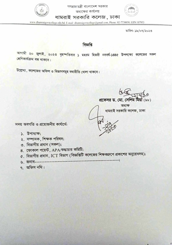 Notice Title : শ্রেণি কার্যক্রম বন্ধের বিজ্ঞপ্তি ১৯/০৭/২০২৩