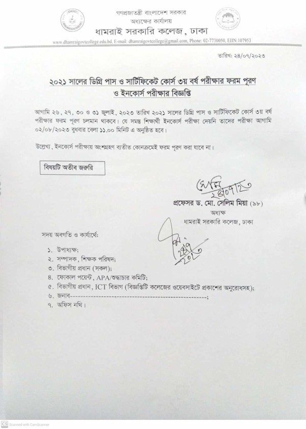 Notice Title : ডিগ্রি ৩য় বর্ষ ইনকোর্স ও ফরম পূরণ বিজ্ঞপ্তি