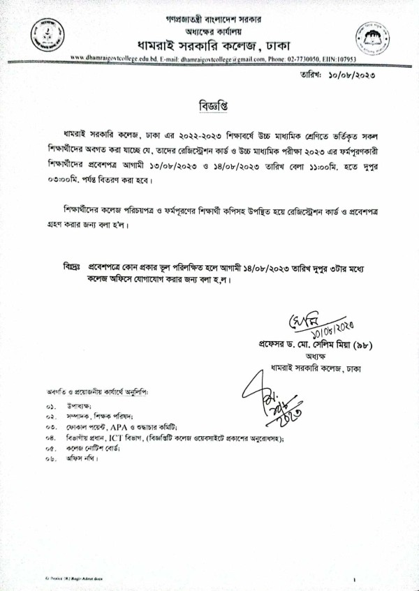 Notice Title : HSC -2023 পরীক্ষার্থীদের প্রবেশপত্র ও রেজিস্ট্রেশন কার্ড বিতরণ প্রসঙ্গে