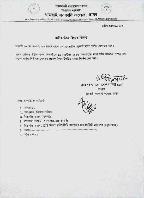 Notice Title : দ্বাদশ শ্রেণির শ্রেণিকার্যক্রম বিষয়ক বিজ্ঞপ্তি