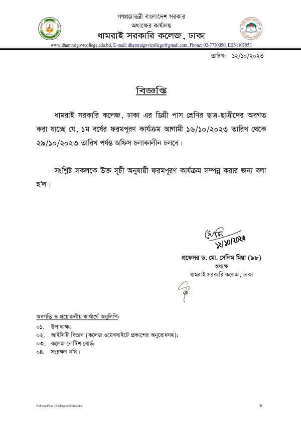 Notice Title : ডিগ্রি পাস ১ম বর্ষের শিক্ষার্থীদের ফরম পূরণের বিজ্ঞপ্তি