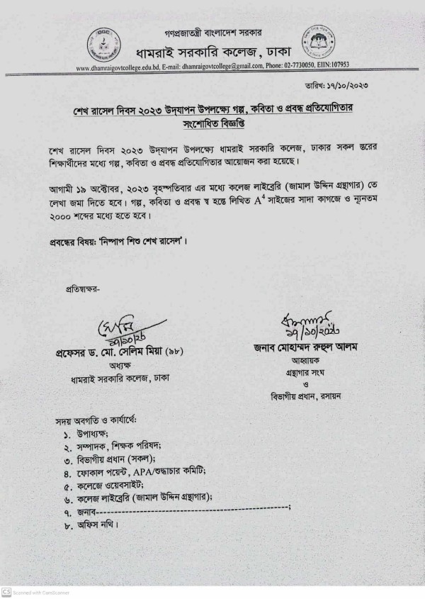 Notice Title : শেখ রাসেল দিবস ২০২৩ উপলক্ষ্যে গল্প, কবিতা ও প্রবন্ধ প্রতিযোগিতার সংশোধিত বিজ্ঞপ্তি