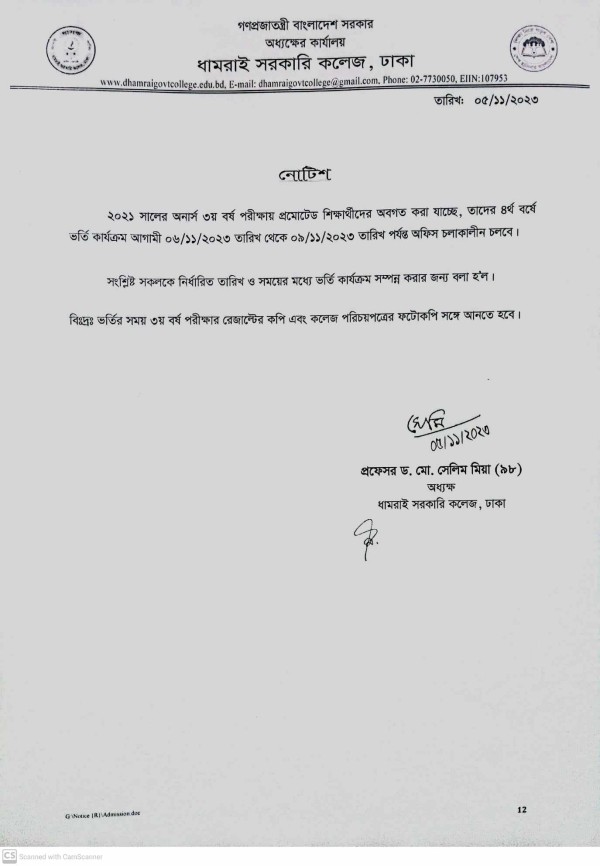Notice Title : অনার্স ৪র্থ বর্ষে ভর্তি বিষয়ক বিজ্ঞপ্তি