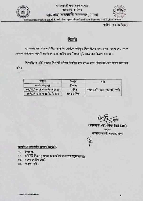 Notice Title : একাদশ শ্রেণির শিক্ষার্থীদের কলেজ পরিচয়পত্র বিতরণ বিষয়ক বিজ্ঞপ্তি