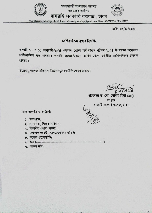 Notice Title : শ্রেণিকার্যকম বন্ধের বিজ্ঞপ্তি