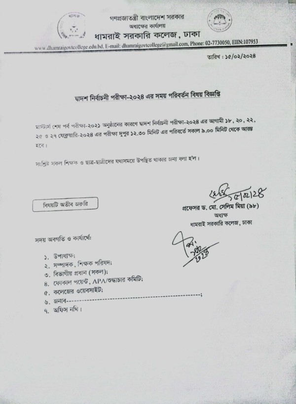 Notice Title : দ্বাদশ শ্রেণির নির্বাচনী পরীক্ষা ২০২৪ এর সময় পরিবর্তন বিষয়ক বিজ্ঞপ্তি