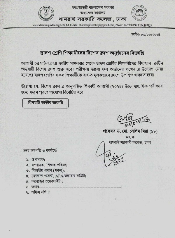 Notice Title : দ্বাদশ শ্রেণি শিক্ষার্থীদের বিশেষ ক্লাশ অনুষ্ঠানের বিজ্ঞপ্তি