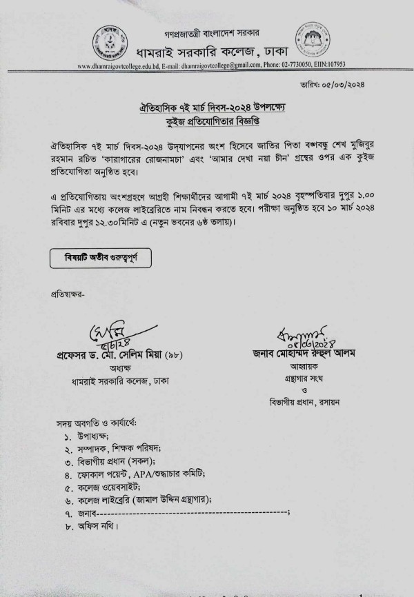 Notice Title : ঐতিহাসিক ৭ই মার্চ দিবস ২০২৪ উপলক্ষ্যে কুইজ প্রতিযোগিতার বিজ্ঞপ্তি