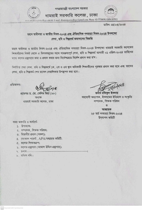 Notice Title : মহান স্বাধীনতা ও জাতীয় দিবস ২০২৪ ও ঐতিহাসিক গণহত্যা দিবস ২০২৪ উপলক্ষ্যে লেখা, ছবি ও শিল্পকর্ম জমাদানের বিজ্ঞপ্তি