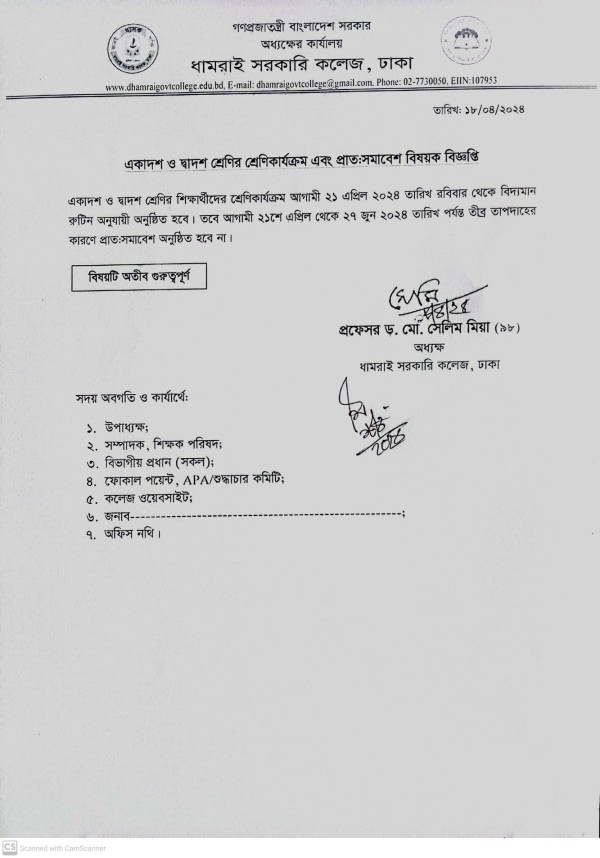Notice Title : একাদশ ও দ্বাদশ শ্রেণির শ্রেণিকার্যক্রম এবং প্রাত:সমাবেশ বিষয়ক বিজ্ঞপ্তি