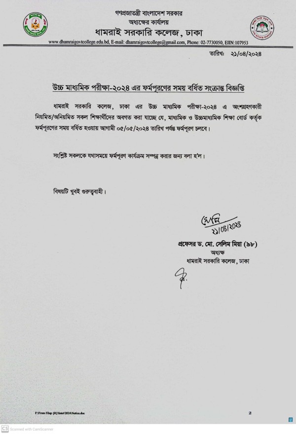 Notice Title : উচ্চ মাধ্যমিক পরীক্ষ ২০২৪ এর ফর্ম পূরণের সময়বর্ধিতকরণ সংক্রান্ত বিজ্ঞপ্তি