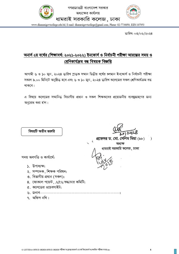 Notice Title : অনার্স ২য় বর্ষ ইনকোর্স ও নির্বাচনী পরীক্ষার সংশোধিত সময়সূচি ও শ্রেণিকার্যক্রম বন্ধের বিজ্ঞপ্তি
