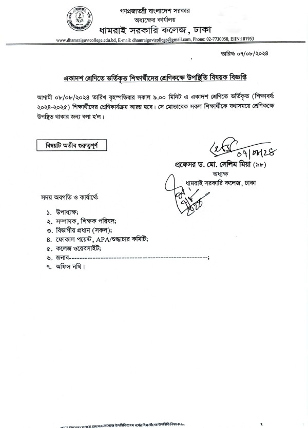 Notice Title : একাদশ শ্রেণিতে (শিক্ষাবর্ষ : ২০২৪-২০২৫) ভর্তিকৃত শিক্ষার্থীদের শ্রেণিকক্ষে উপস্থিতি বিষয়ক বিজ্ঞপ্তি