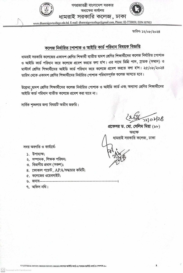 Notice Title : শিক্ষার্থীদের কলেজ নির্ধারিত পোশাক ও আইডি কার্ড পরিধান বিষয়ক বিজ্ঞপ্তি