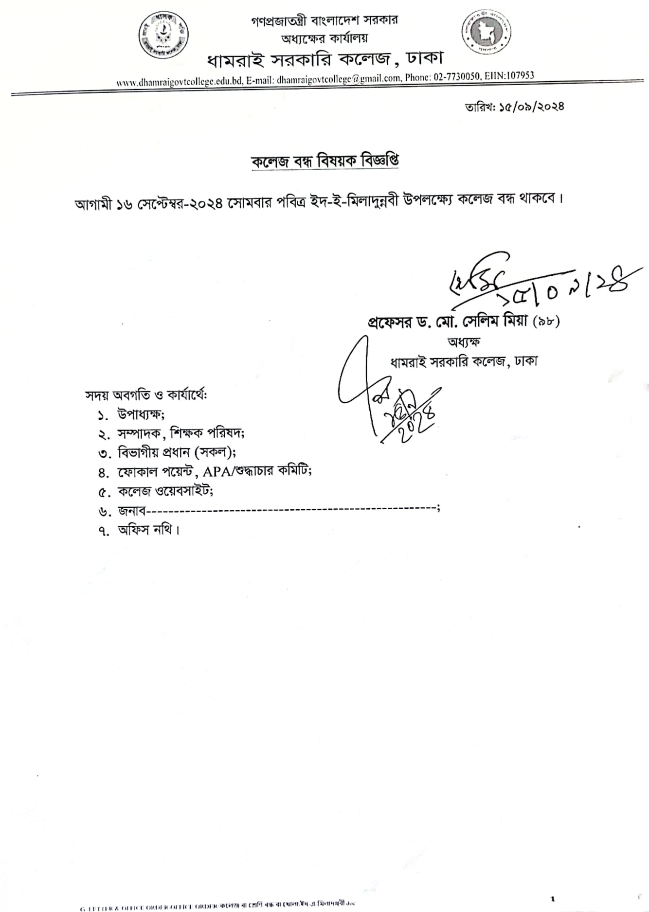 Notice Title : পবিত্র ইদ-ই-মিলাদুন্নবী (সা.) উপলক্ষ্যে কলেজ বন্ধ বিষয়ক বিজ্ঞপ্তি