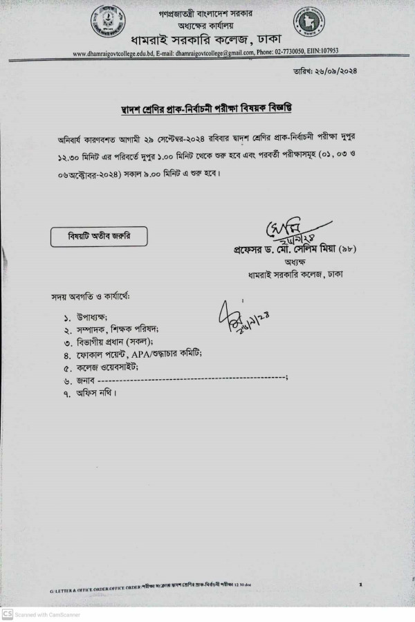 Notice Title : দ্বাদশ শ্রেণির প্রাক-নির্বাচনী পরীক্ষা - ২০২৪ বিষয়ক বিজ্ঞপ্তি
